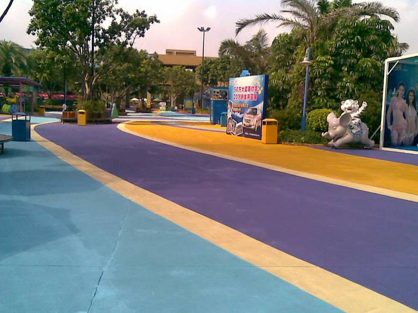 ⑥彩砂面漆:用自流平型彩砂面漆均匀镘涂一道,完工后整体地面达到光亮洁净,颜色均一,无空鼓;